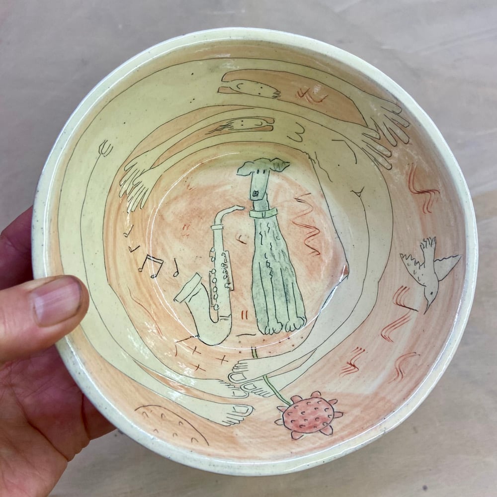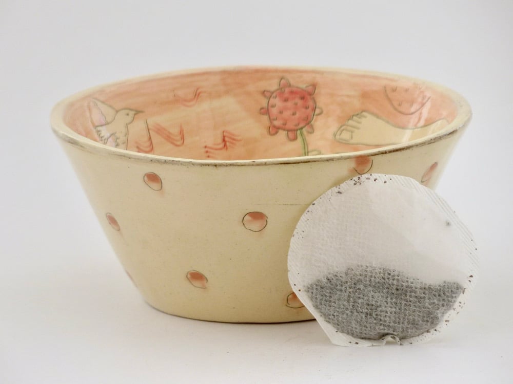 Hand made, press-moulded small earthenware bowl decorated with coloured slips, brush work and sgraffito 16cmD x 8cmH