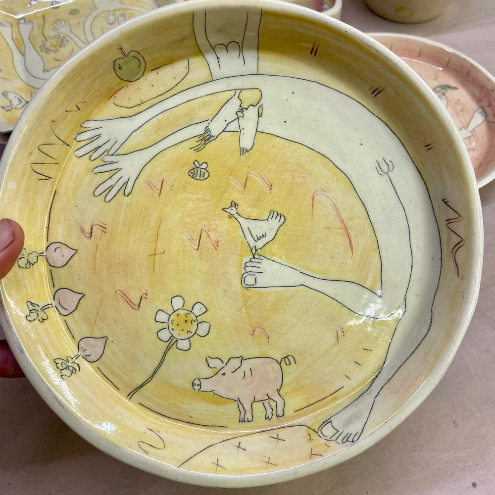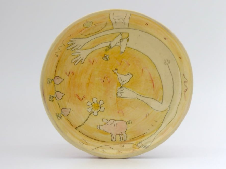 Handmade, press-moulded earthenware plate decorated using coloured slips, brushwork & sgraffito. 21cmD