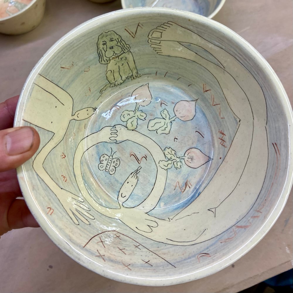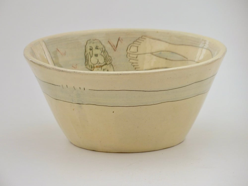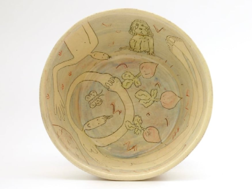 Hand made, press-moulded small earthenware bowl decorated with coloured slips, brush work and sgraffito 16cmD x 8cmH