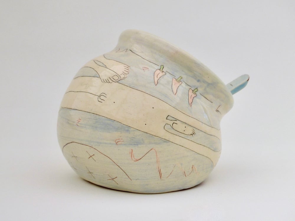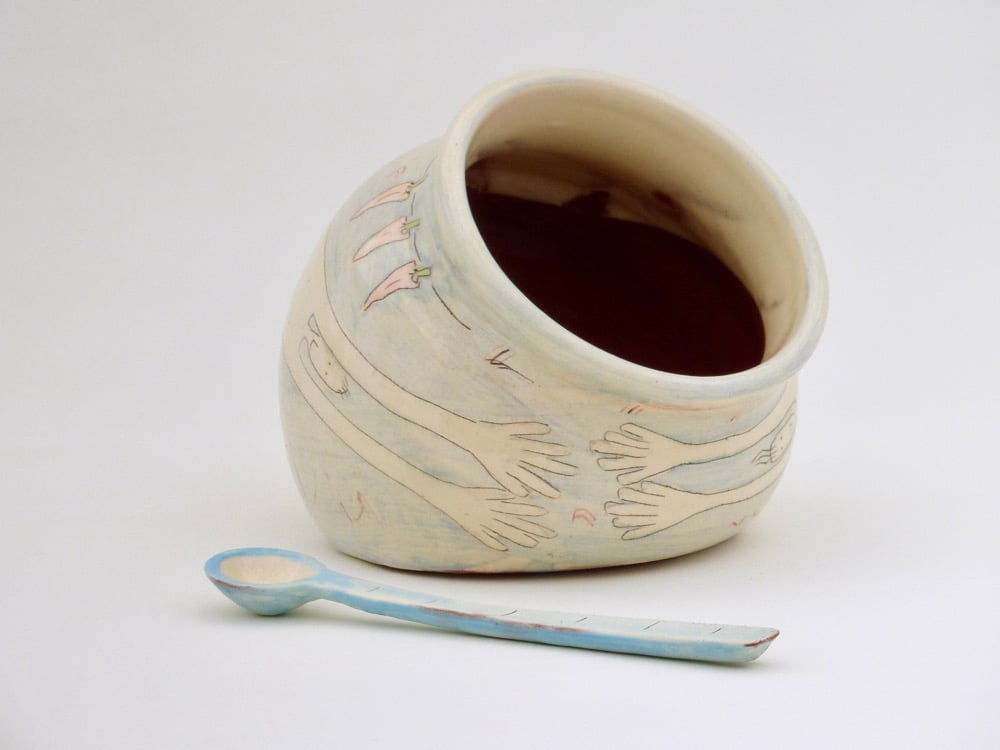Hand made, thrown and altered, earthenware salt pig decorated with coloured slips, brush work and sgraffito. W13cm H12cm