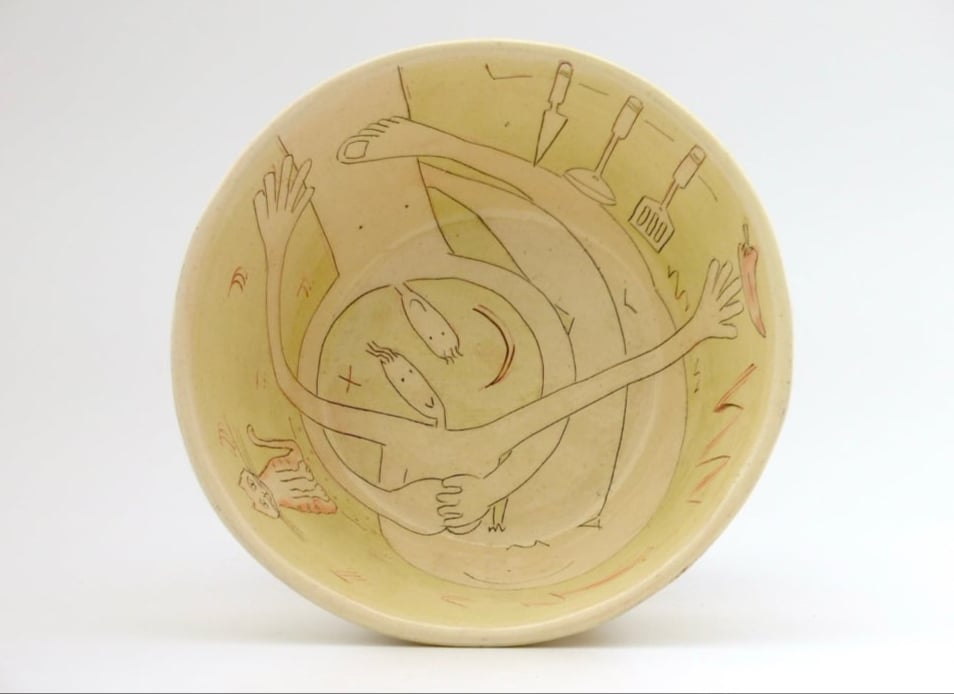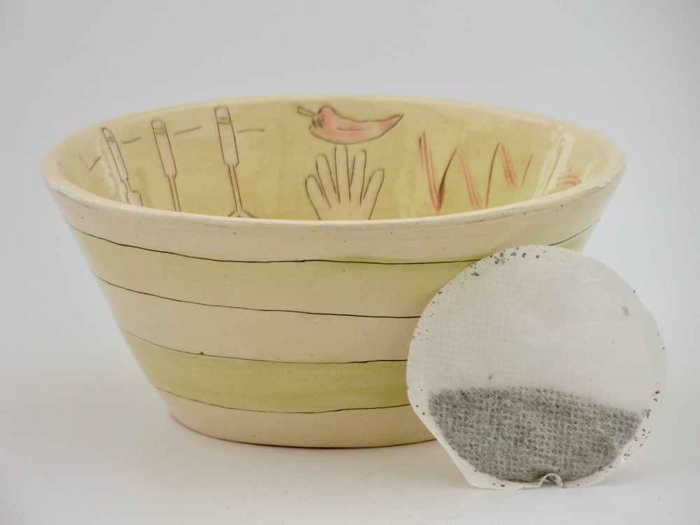 Hand made, press-moulded small earthenware bowl decorated with coloured slips, brush work and sgraffito 16cmD x 8cmH