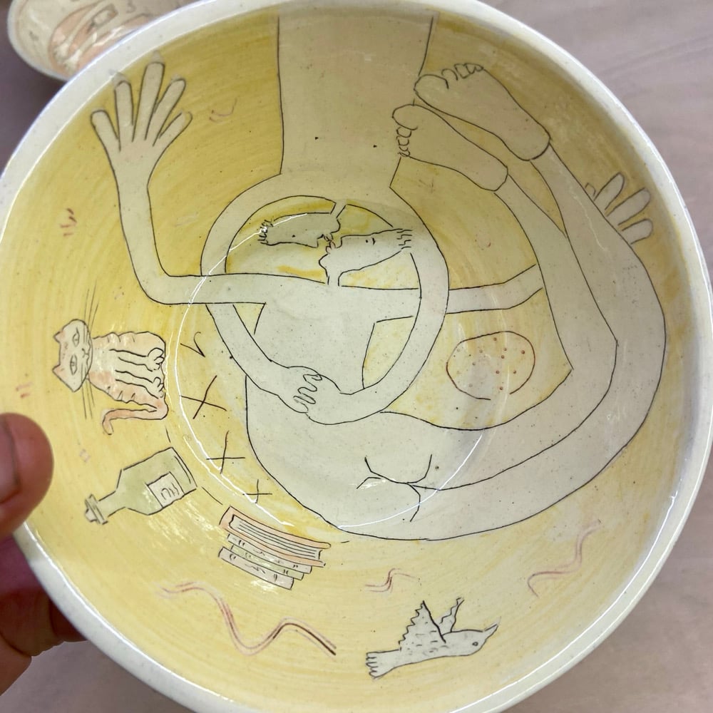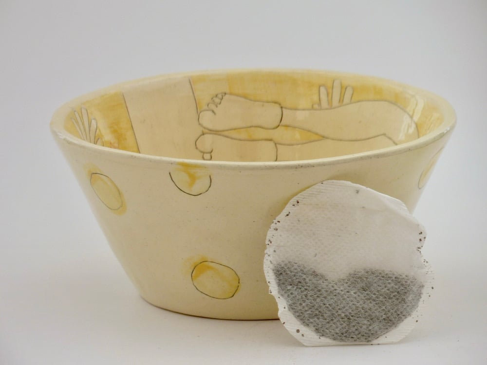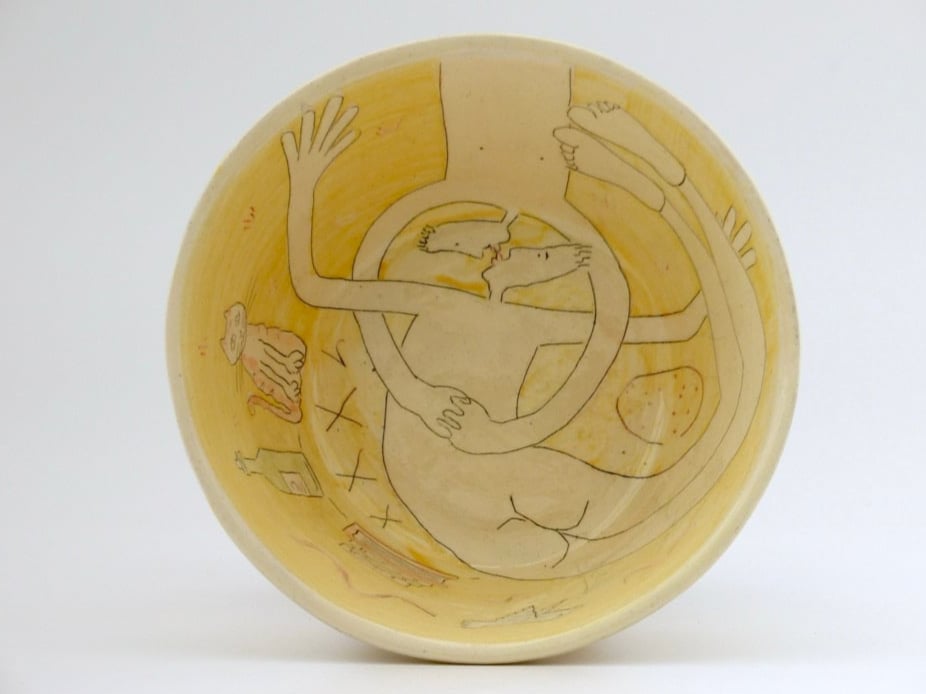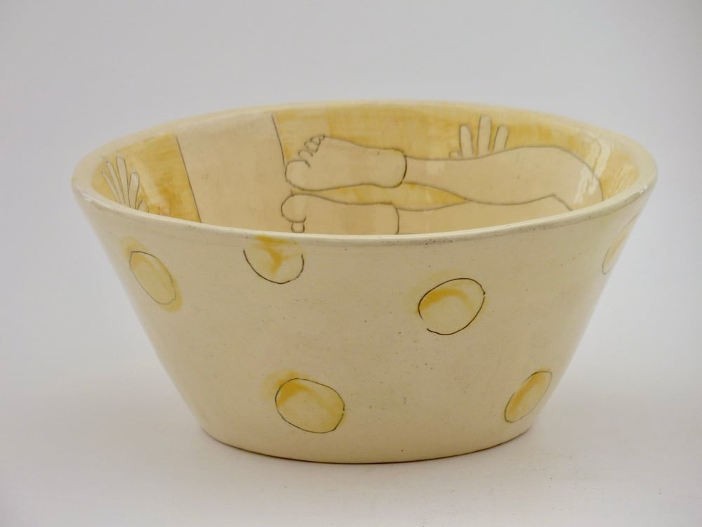 Hand made, press-moulded small earthenware bowl decorated with coloured slips, brush work and sgraffito 16cmD x 8cmH