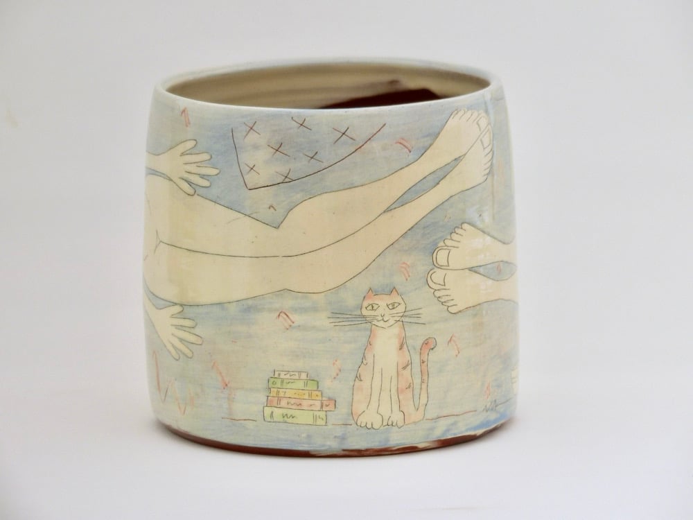 Thrown earthenware utensil pot decorated with coloured slips, brush work and sgraffito. H15cm D15cm H15cm D15cm